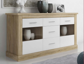 - Aparador compuesto por tres cajones y dos puertas de cristal, con acabados aparentemente rústicos pero que guarda una original línea moderna.