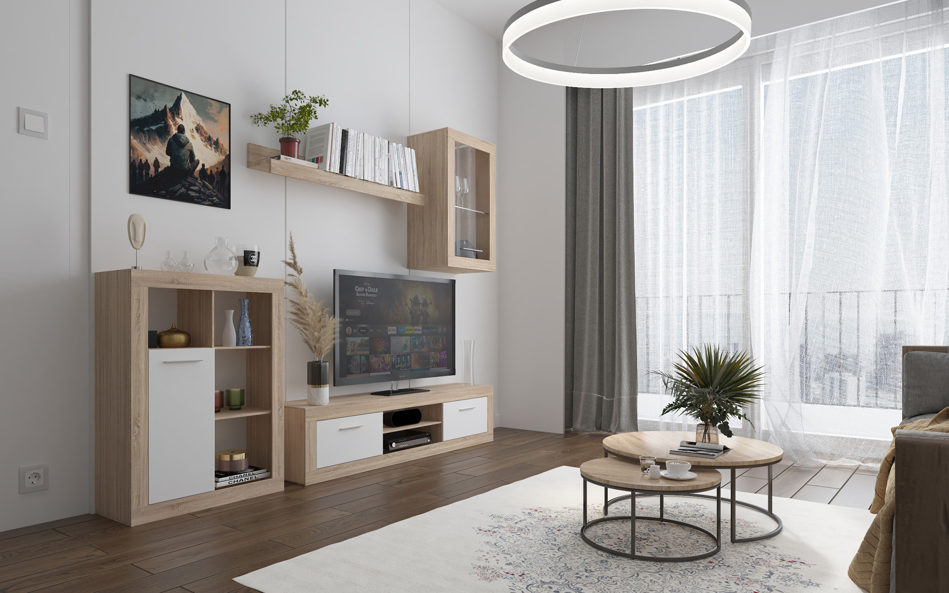 Composición Barcelona Cambrian / Blanco SKU: MP-0004 Descripción Composición Barcelona Incluye: Mueble de televisión, vitrina baja, estantería y vitrina de colgar volver a la lista