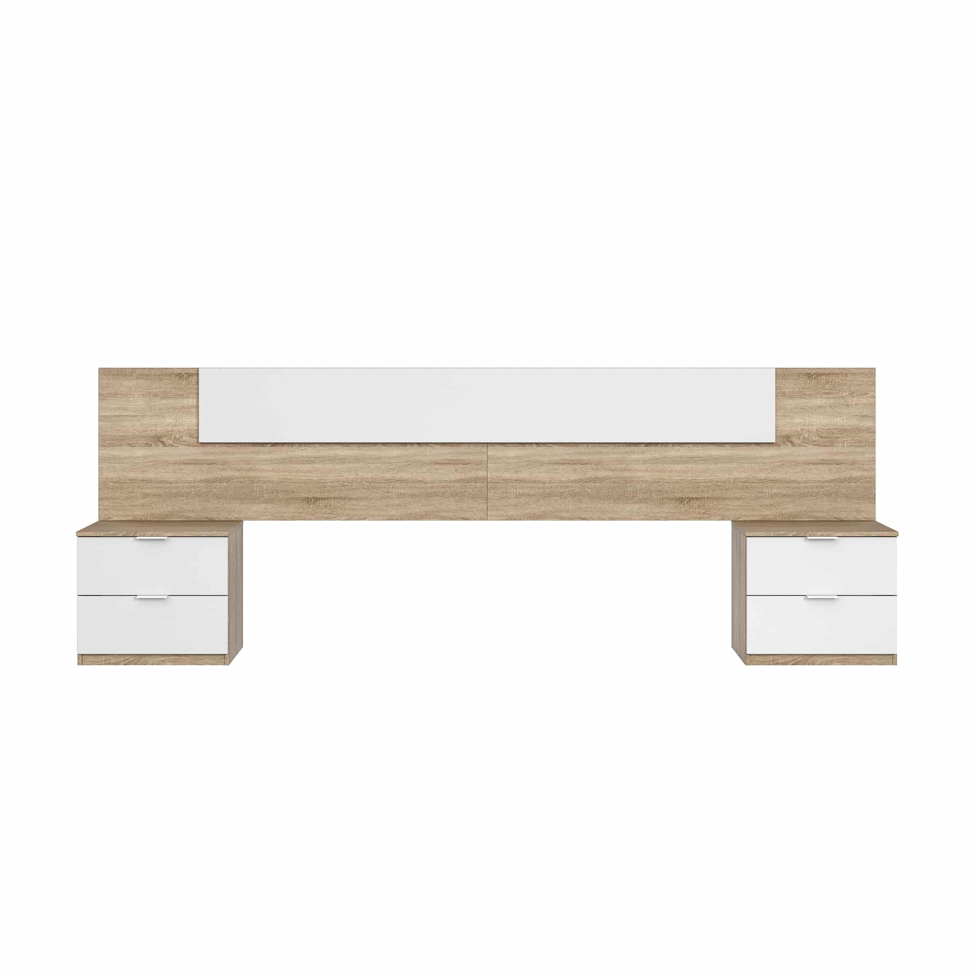 Conjunto cabecero + 2 mesitas de noche Alaya SKU: FORES-016075F Descripción Conjunto cabecero + 2 mesitas de noche Alaya Color: Roble Alaska / Blanco ártico Dimensiones (cm): 196 x 156 x 37cm volver a la lista