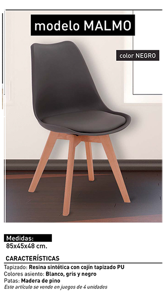 Juego de 4 Sillas Tapizadas Patas de Madera Mod. Malmo Negro Silla con patas de madera. Respaldo y asientos realizados en resina. Asiento acolchado Medidas: 85×45×48 Descripción Silla con patas de madera. Respaldo y asientos realizados en resina. Asiento acolchado Medidas: 85×45×48 volver a la lista