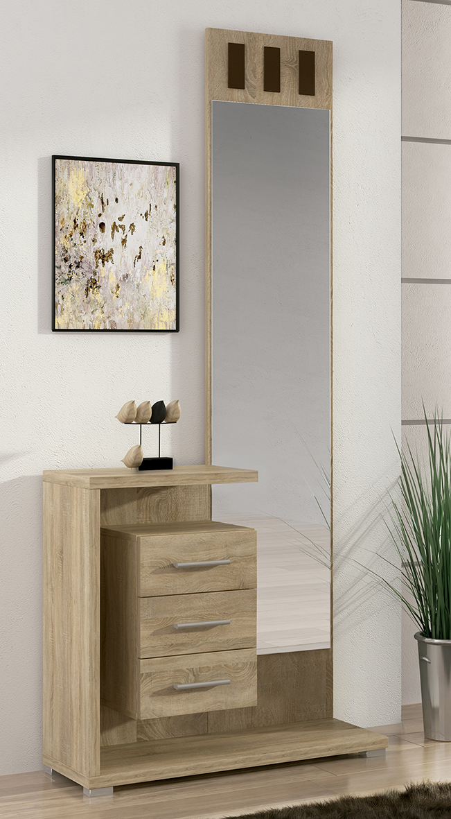 • Este mueble de recibidor te ofrece además un generoso espacio de almacenaje gracias a sus 3 cajones y la estructura que los rodea, y que te propone una repisa superior sobre la que situar la bandeja de las llaves o algún accesorio decorativo, y una repisa inferior ideal para dejar los zapatos al entrar en casa.