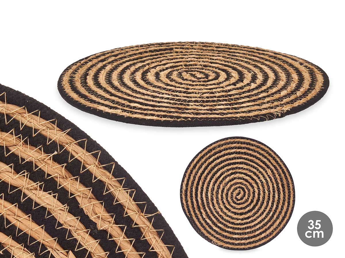 Salva mantel de esparto centro tela negro SKU: AR-17544 Peso: 1 kg Descripción Salva mantel de esparto centro tela negro Dimensiones (cm): 35 x 35 x 0,6 cm. volver a la lista